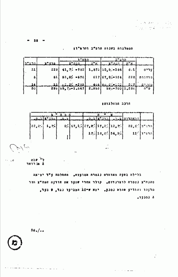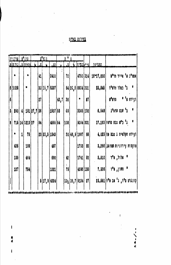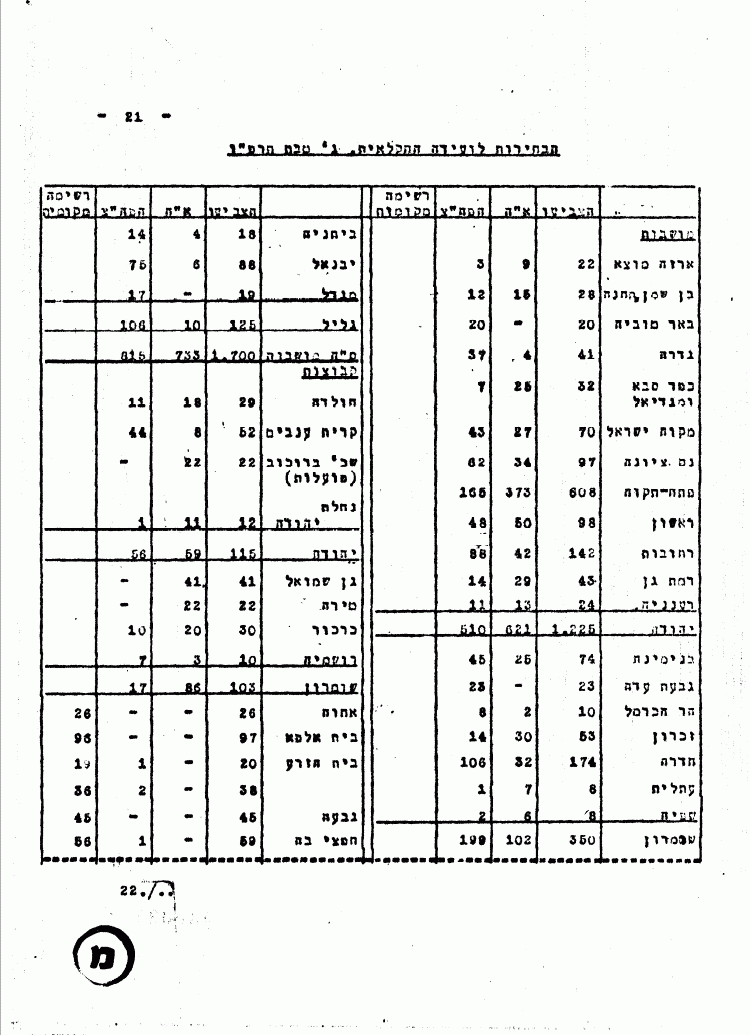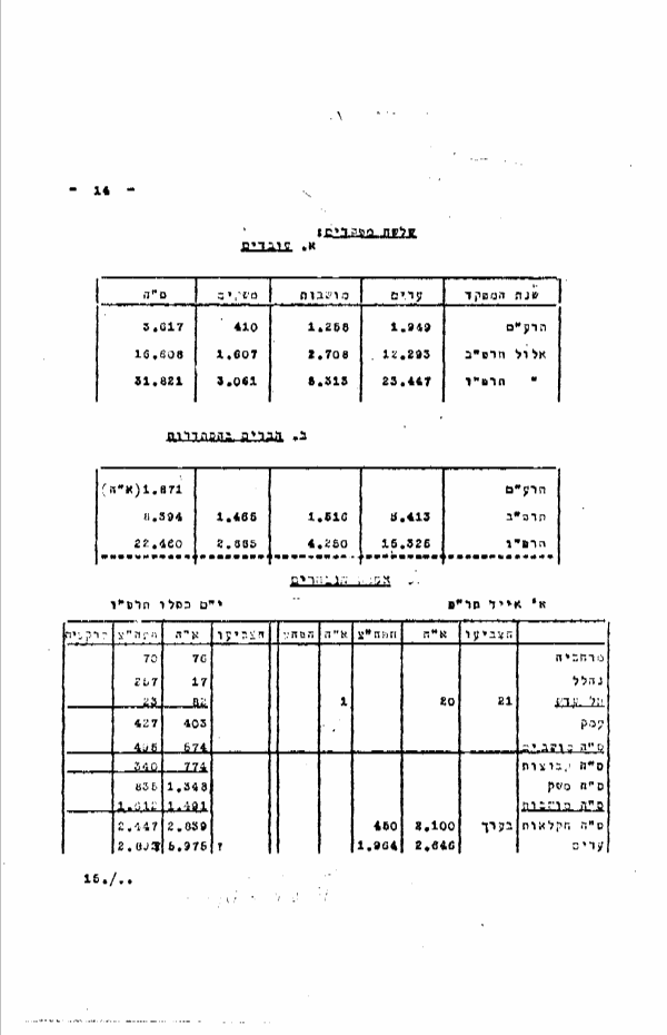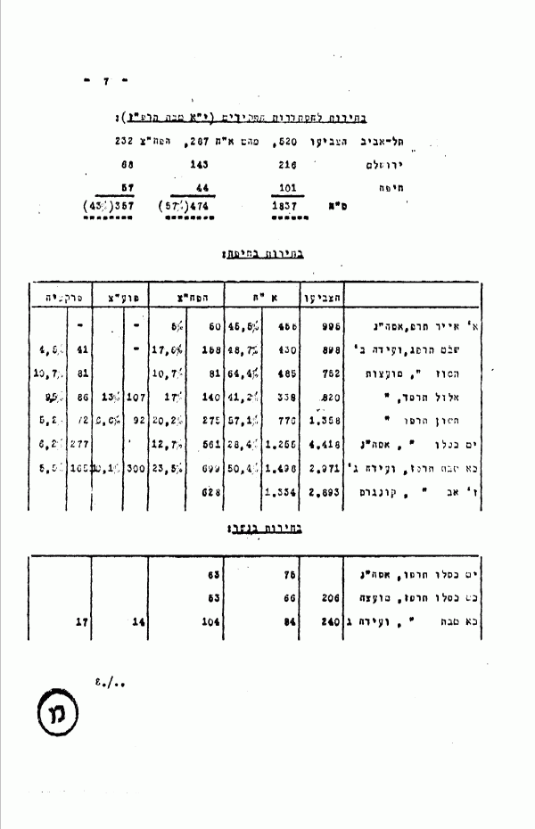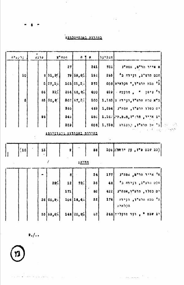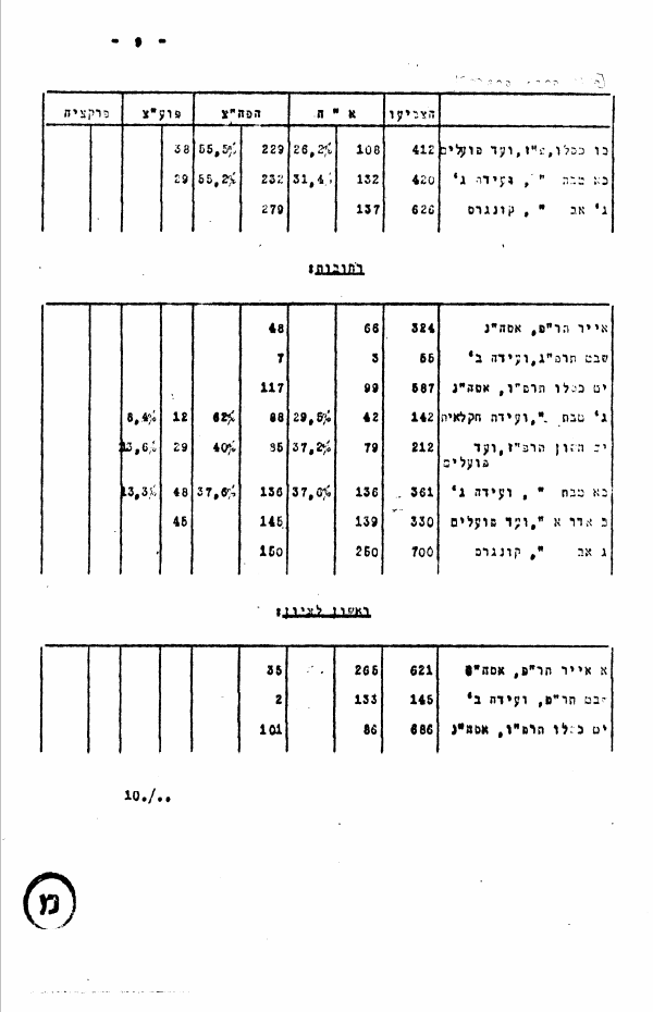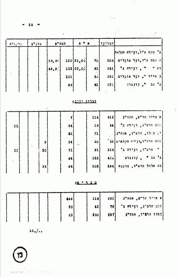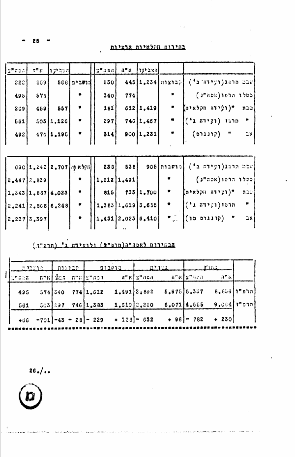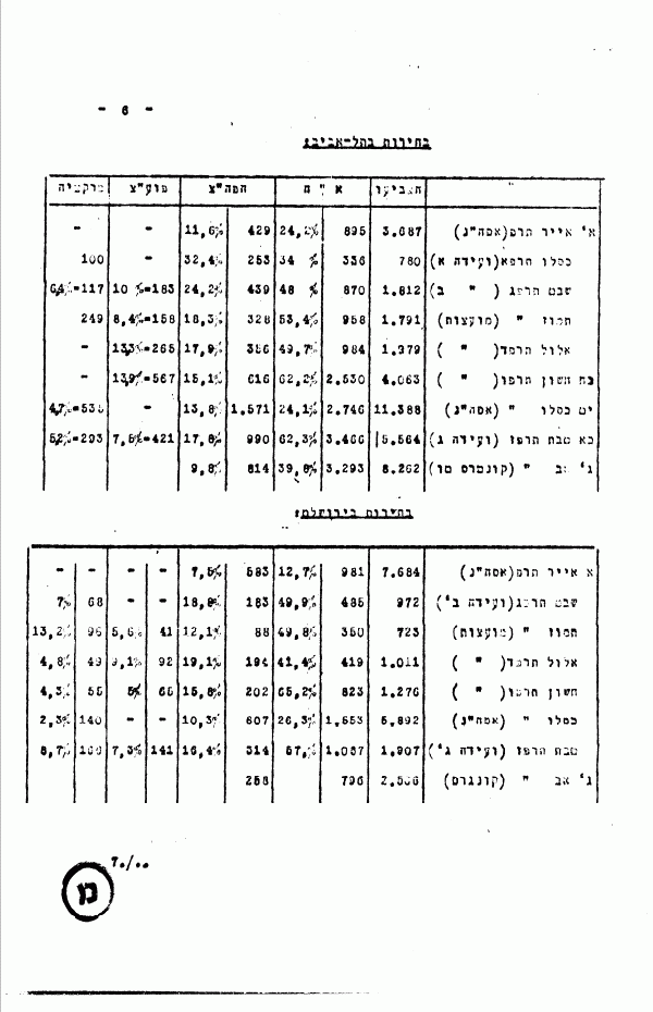 {0067-01} ]תוצאות הבחירות להסתדרות שנערכו בסוף דצמבר 1926 טבלת נתונים מספריים ראה טקסט מודפס[ כ"ז טבת תרפ"ז 1 ינואר 1927 הצביעו א"ה הפה"צ פוע"צ קבוצים גוש אופוז במ רויז קבוצות אילת [5#] 1 3 4 9 29 = 1 1 גשר 3 49 52 דגניה א1 48 11 61 . " ב44 11 55 . כנרת 2 1 33 36 73 מרקנהוף גליל הקבוצות מושבים 28 4 3 1 0 9 561 503 1.126 = = = = = = = = = = = = = = = = = = = = = = = = = = = = = = = = = משקים 31 20 145 5 197 47 858 1.249 2.591 מושבות 246,105 88 161 77 363 282 2.241 2.861 6 חקלאות ערים 070 10.671,260 6,99 155 154 630 321 910 2 עוברים ס"ה 555 9.064 17.183,205 246 227 715 709 1.213 4 =================================================================== {0067-02} הצביעו א"ה הפה"צ פוע"צ קבוצים גוש אופוז במ רויז קבוצות חולדה 10 17 27 קרית ענבים 3 1 45 4 88 גן שמואל 4 1 27 39 כרכור 1 10 16 42 טירה 8 31 2C 1 5 4 1 אחוה אבו שושה 1 9 1 11 בית אלפא 1 23 1 47 5 5 20 102 גניגר 9 14 19 44 גבתון 11 11 גבעה ושרון 32 55 חפצי בה 67 = 1 33 10 1 12 יגור ג3 68 7 מרחביה 11 2 3 2 27 46 עין חרוד 8ה1 1 9 11 259 2 צריפין 5 6 21 10 44 תל יוסף 5 73 2 72 15 9 48 224 עמק 01 515 984ג 2 4 140 3 160 ================================================================= {0067-03} כ"ט טבת 3 ינואר נסעתי בצהרים לחיפה. בערב חגג אבא את מלואת לו שבעים שנה. הצביעו א"ה הפה"צ פוע"צ קבוצים גוש אופוז במ רויז מושבים בן שמן 2 39 26 67 נחלת יהודה 27 1 3 66 101 עטרות 2 26 26 עין חי יהודה בלפוריה 1 1 33 37 72 כפר יחזקאל 3 2 7 148 187 מרחביה 68 4 110 נהלל 3 3 1 330 49 385 תל עדשים עמק מחנים מושבים 28 4 3 1 6 9 561 503 .1 26 =================================================================== {0067-04} א' שבט, 4.1.1927 הצביעו א"ה הפה"צ פוע"צ קבוצים גוש אופוז ב.מ. רויז פתח-תקוה 31 17 5 99 3 362 553 1.163 רעננה 13 9 22 ראשון 113 81 238 - 7 20 3 11 1 רחובות מושבות יהודה 2 2 - 116 31 C1 4 15 1 בנימינה גבעת עדה 1 1 19 2 23 בת שלמה 3 3 - - זכרון 22 13 30 71 91 228 חדרה 7 8 1 2 1 29 232 132 410 עתלית 6 29 40 שפיה מושבות שומרון 3 כפר ילדים 9 2 17 - 2 4 ביתניה 20 יבנאל 22 41 מגדל 1 25 2 6 - 1 מתולה 5 6 2 3 .0 (חוצבים) גליל 2 5 1 6 4 66 56 146 ס"ה מושבות 74 68 16 72 166 235 1.383 1.612 3.655 =============================================================================== {0067-05} תוצאות הבחירות לועידה השלישית כ"א טבת תרפ"ז הצביעו א"ה הפה"צ פוע"צ קבוצים גוש אופוז ב.מ. רויז . ריקים פסול תל-אביב 48 132 35 289 35 421 907 3235 5142 חיפה 40 12 45 165 168 300 696 1422 2872 ירושלם 66 88 141 310 1081 1630ג 34 סג גג טבריא 9 90 147 256 - 7 - - = עפולה 81 31 120 100 320 - 1 12 - עכו 8 107 28 155 - 8 3 - - עזה 4 19 32 - 9 - - - צפת, 28 33 58 צמח ערים מושבות באר טוביה 10 19 30 באר יעקב 11 . 14 ברוכוב מונטיפיורי ר"ג, ב"ב 3 1 20 56 183 270 - 3 3 גדרה 5 1 18 7 31 הרצליה 1 3 27 48 82 - 3 כפר סבא 4 12 1 8 60 84 - 1 מגדיאל 1 1 8 8 42 87 מקוה 1 12 4 . 29 38 81 מוצא 1 4 6 11 נס ציונה 2 2 1 14 5 1 138 78 242 =================================================================== {0067-06} בחירות בתל-אביב: הצביעו א " ח הפה"צ פוע"צ פרקציה א' אייר תרפ(אסה"נ) 895 3.6 י.,.2@ 429 ,24 11.6 - - כסלו תרפא(ועידה א) 336 780 @ ...4 253 ,34 32 - 100 שבט תרפג ( " ב) 870 1.812 @ .. 439 48,2,183 @=24 117 =10ל.@@ תמוז " (מועצות) 958 1.791 .,.4@ 328 53,3,158 249@,=18 8.4 אלול תרפד( " ) .@79 984 @.1י.,7 356 49,9,265 @@@@=17 1 - כח חשון תרפו( " ) . 2.530 .,@@4.063 616 62י1,567 @@@=15 1 - יט כסלו " (אסה"נ) 2.746@88 .11 1,1.571,@ 24 13,.6@ @ - @@@,."535 כא טבת תרפז (ועידה ג) @5.564 3.466 ,3@ 990 62 8,421@ 5,293@=17 @@,.=7 ג' אב " (קונגרס) 3.293 8.262 ,@@ 814 39 9,@@ בחירות בירושלים א אייר תרפ(אסה"נ) 981 7.684 ,7@ 583 12 ,@@ 7 - - - - שבט תרפג(ועידה ב') 485 972 י,.9 183 49 ,@@@ 18 - - 68 7@ תמוז " (מועצות) 350 723 י,.8 88 49 @י1,2ו . 6,96@41 5 אלול תרפד( " ) 1ג 419 1.0 ,@@ 194 41 .,1@ 92 1,49@,19 9 חשון תרפו( " ) 823 1.276 .,2@ 202 ,@65 65 18 @@ ..3 55,4 כסלו " (אסה"נ) 1.553 5.892 י,3@ 607 26 ,..3@ 10 - - 140 7:7,8 1oC @3,. 16 67,141 314 1.907,4.. 1.087 .. )'טבת תרפז (ועידה ג 2.5.u 796 258 )ג' אב " (קונגרס {0067-07} בחירות להסתדרות הפקידים ( י"א טבת תרפ"ז ): תל-אביב הצביעו ,520 מהם א"ה ,287 הפה"צ 232 ירושלם 66 143 216 חיפה 67 44 101 ס"ה 474 1837(%57) 357 (%43) ==== ====== ======== בחירות בחיפה : הצביעו א "ה הפה"צ פוע"צ פרקציה א' אייר תרפ,אסה"נ . 455 ,995:6 5 50 45 - - שבט תרפג,ועידה ב' 430 898 ,6 1 8 ,46 17 - ..5 41,4 תמוז ," מועצות 4 485 ,752 81 64 ,.7; 81 10 ,7,10 אלול תרפד, " 3 8 20 : ,9 86 13 . 107 1 . 140 41 חשון תרפו " . 77 .1.358,1,2 275 .,57 92 20(,6 2 2,5 יט כסלו " , אסה"נ 4 . 1.255 ,4.416 ..7 61 2,2 . 12,6 כא טבת תרפז, ועידה ג' 4 1.498 2.971,5 69 50,1 300 ,23 1 5 . ,5 ז' אב " , קונגרס 628 1.334 2.693 בחירות בנשר: יט כסלו תרפו, אסה"נ 63 75 כט כסלו תרפז, מועצה 83 66 206 כא טבת " , ועידה ג 17 14 104 84 240 {0067-08} בחירות בפתח-תקוה: הצביעו א " ה ה