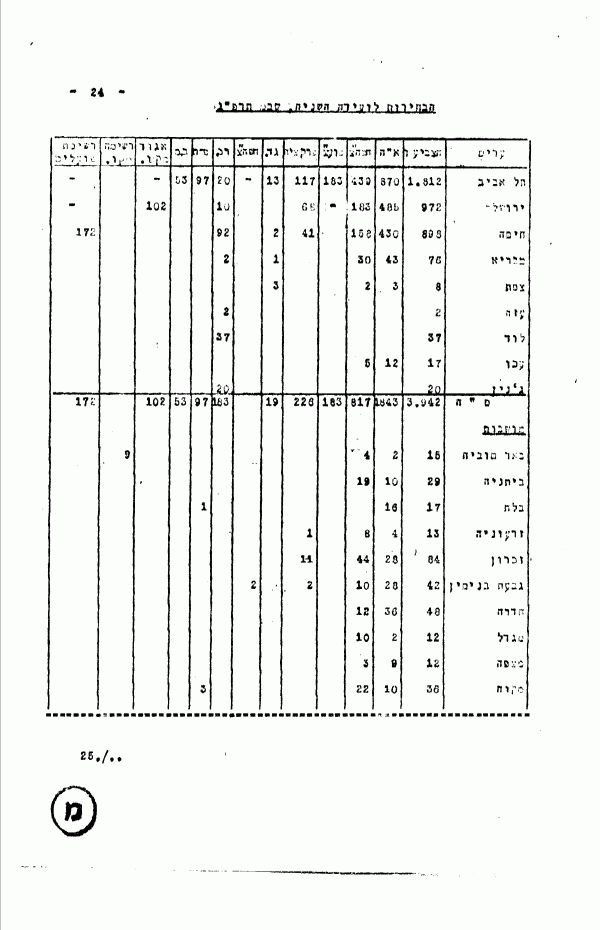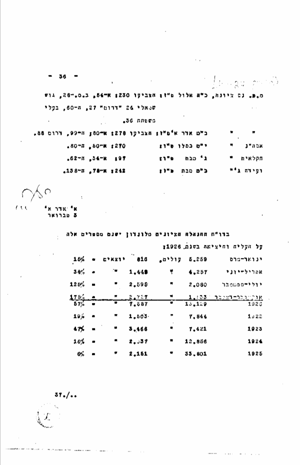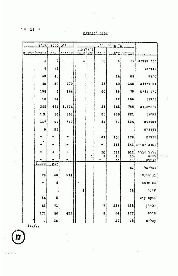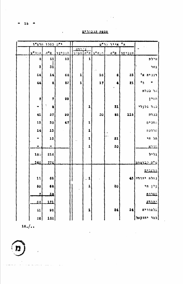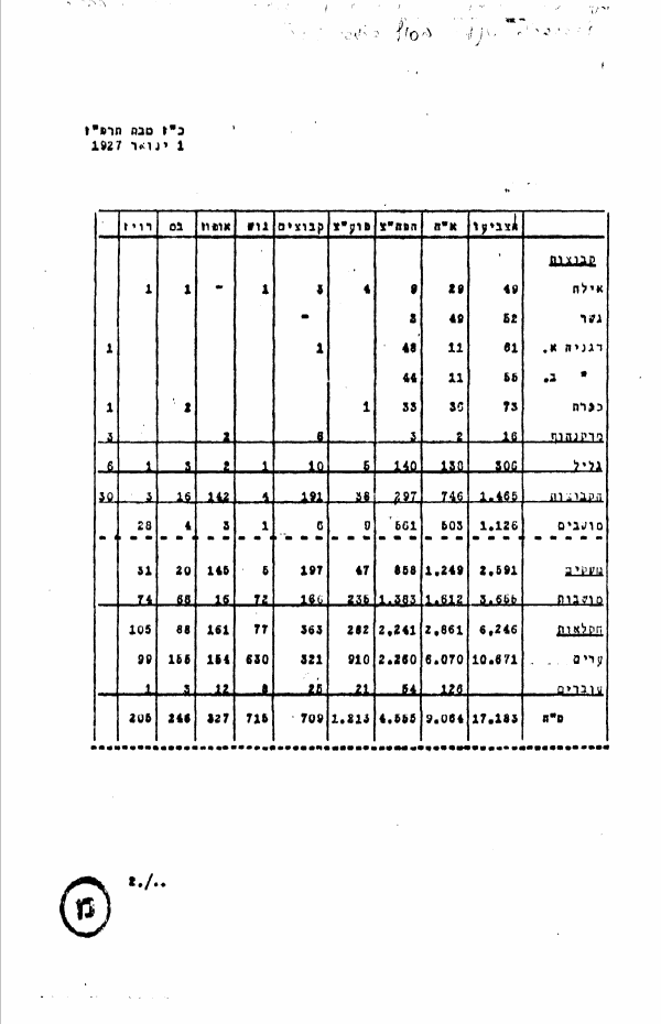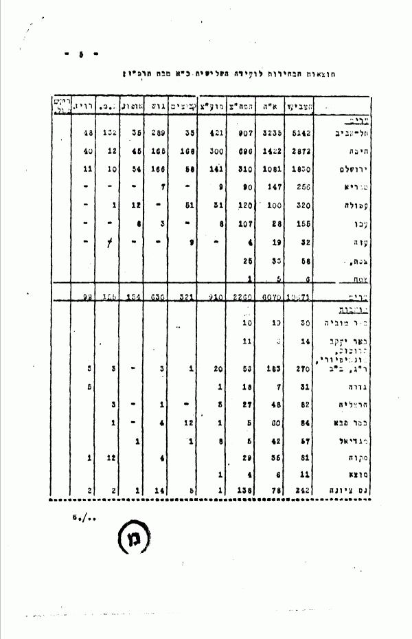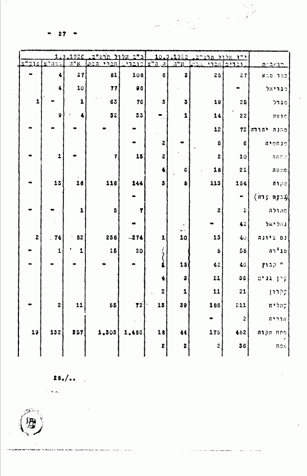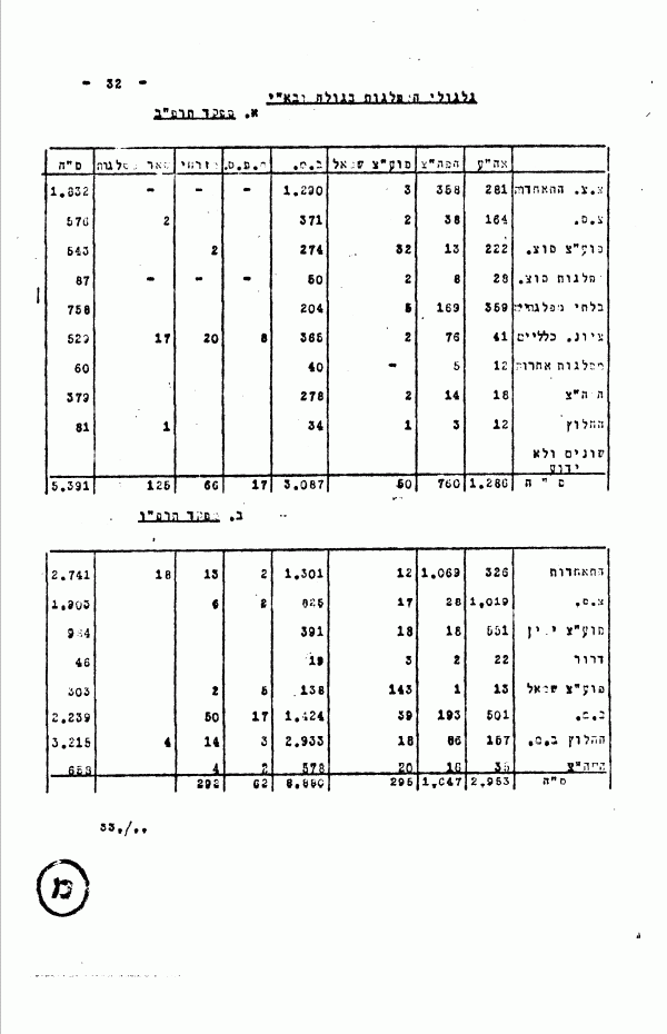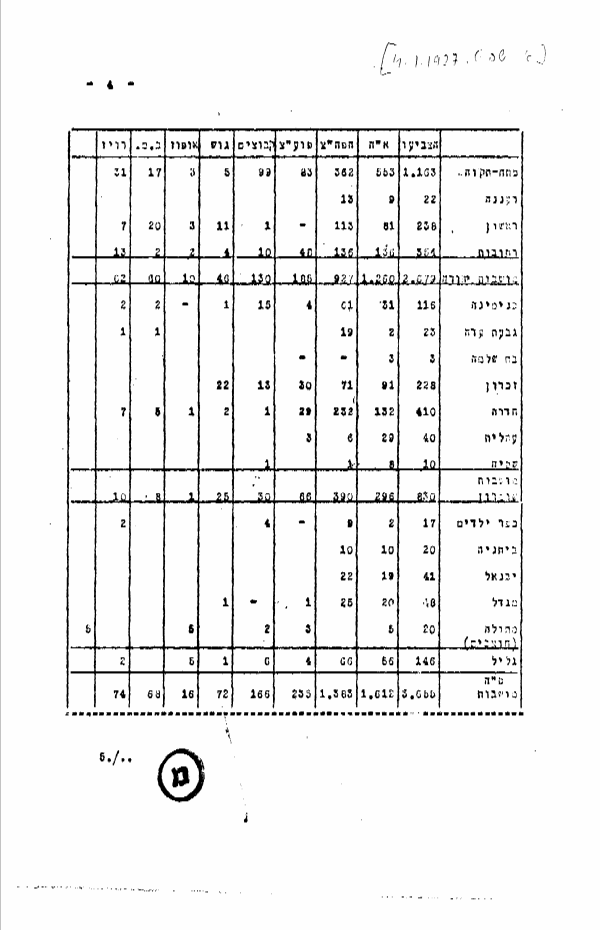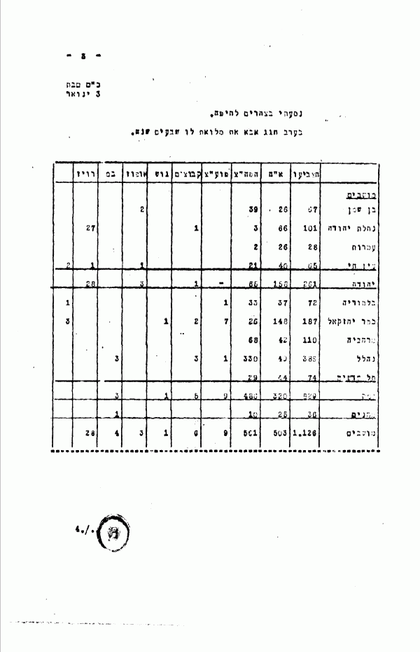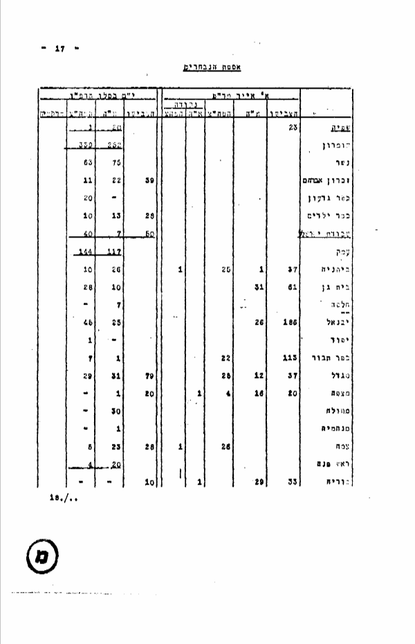 {0067-01} ]תוצאות הבחירות להסתדרות שנערכו בסוף דצמבר 1926 טבלת נתונים מספריים ראה טקסט מודפס[ כ"ז טבת תרפ"ז 1 ינואר 1927 הצביעו א"ה הפה"צ פוע"צ קבוצים גוש אופוז במ רויז קבוצות אילת [5#] 1 3 4 9 29 = 1 1 גשר 3 49 52 דגניה א1 48 11 61 . " ב44 11 55 . כנרת 2 1 33 36 73 מרקנהוף גליל הקבוצות מושבים 28 4 3 1 0 9 561 503 1.126 = = = = = = = = = = = = = = = = = = = = = = = = = = = = = = = = = משקים 31 20 145 5 197 47 858 1.249 2.591 מושבות 246,105 88 161 77 363 282 2.241 2.861 6 חקלאות ערים 070 10.671,260 6,99 155 154 630 321 910 2 עוברים ס"ה 555 9.064 17.183,205 246 227 715 709 1.213 4 =================================================================== {0067-02} הצביעו א"ה הפה"צ פוע"צ קבוצים גוש אופוז במ רויז קבוצות חולדה 10 17 27 קרית ענבים 3 1 45 4 88 גן שמואל 4 1 27 39 כרכור 1 10 16 42 טירה 8 31 2C 1 5 4 1 אחוה אבו שושה 1 9 1 11 בית אלפא 1 23 1 47 5 5 20 102 גניגר 9 14 19 44 גבתון 11 11 גבעה ושרון 32 55 חפצי בה 67 = 1 33 10 1 12 יגור ג3 68 7 מרחביה 11 2 3 2 27 46 עין חרוד 8ה1 1 9 11 259 2 צריפין 5 6 21 10 44 תל יוסף 5 73 2 72 15 9 48 224 עמק 01 515 984ג 2 4 140 3 160 ================================================================= {0067-03} כ"ט טבת 3 ינואר נסעתי בצהרים לחיפה. בערב חגג אבא את מלואת לו שבעים שנה. הצביעו א"ה הפה"צ פוע"צ קבוצים גוש אופוז במ רויז מושבים בן שמן 2 39 26 67 נחלת יהודה 27 1 3 66 101 עטרות 2 26 26 עין חי יהודה בלפוריה 1 1 33 37 72 כפר יחזקאל 3 2 7 148 187 מרחביה 68 4 110 נהלל 3 3 1 330 49 385 תל עדשים עמק מחנים מושבים 28 4 3 1 6 9 561 503 .1 26 =================================================================== {0067-04} א' שבט, 4.1.1927 הצביעו א"ה הפה"צ פוע"צ קבוצים גוש אופוז ב.מ. רויז פתח-תקוה 31 17 5 99 3 362 553 1.163 רעננה 13 9 22 ראשון 113 81 238 - 7 20 3 11 1 רחובות מושבות יהודה 2 2 - 116 31 C1 4 15 1 בנימינה גבעת עדה 1 1 19 2 23 בת שלמה 3 3 - - זכרון 22 13 30 71 91 228 חדרה 7 8 1 2 1 29 232 132 410 עתלית 6 29 40 שפיה מושבות שומרון 3 כפר ילדים 9 2 17 - 2 4 ביתניה 20 יבנאל 22 41 מגדל 1 25 2 6 - 1 מתולה 5 6 2 3 .0 (חוצבים) גליל 2 5 1 6 4 66 56 146 ס"ה מושבות 74 68 16 72 166 235 1.383 1.612 3.655 =============================================================================== {0067-05} תוצאות הבחירות לועידה השלישית כ"א טבת תרפ"ז הצביעו א"ה הפה"צ פוע"צ קבוצים גוש אופוז ב.מ. רויז . ריקים פסול תל-אביב 48 132 35 289 35 421 907 3235 5142 חיפה 40 12 45 165 168 300 696 1422 2872 ירושלם 66 88 141 310 1081 1630ג 34 סג גג טבריא 9 90 147 256 - 7 - - = עפולה 81 31 120 100 320 - 1 12 - עכו 8 107 28 155 - 8 3 - - עזה 4 19 32 - 9 - - - צפת, 28 33 58 צמח ערים מושבות באר טוביה 10 19 30 באר יעקב 11 . 14 ברוכוב מונטיפיורי ר"ג, ב"ב 3 1 20 56 183 270 - 3 3 גדרה 5 1 18 7 31 הרצליה 1 3 27 48 82 - 3 כפר סבא 4 12 1 8 60 84 - 1 מגדיאל 1 1 8 8 42 87 מקוה 1 12 4 . 29 38 81 מוצא 1 4 6 11 נס ציונה 2 2 1 14 5 1 138 78 242 =================================================================== {0067-06} בחירות בתל-אביב: הצביעו א " ח הפה"צ פוע"צ פרקציה א' אייר תרפ(אסה"נ) 895 3.6 י.,.2@ 429 ,24 11.6 - - כסלו תרפא(ועידה א) 336 780 @ ...4 253 ,34 32 - 100 שבט תרפג ( " ב) 870 1.812 @ .. 439 48,2,183 @=24 117 =10ל.@@ תמוז " (מועצות) 958 1.791 .,.4@ 328 53,3,158 249@,=18 8.4 אלול תרפד( " ) .@79 984 @.1י.,7 356 49,9,265 @@@@=17 1 - כח חשון תרפו( " ) . 2.530 .,@@4.063 616 62י1,567 @@@=15 1 - יט כסלו " (אסה"נ) 2.746@88 .11 1,1.571,@ 24 13,.6@ @ - @@@,."535 כא טבת תרפז (ועידה ג) @5.564 3.466 ,3@ 990 62 8,421@ 5,293@=17 @@,.=7 ג' אב " (קונגרס) 3.293 8.262 ,@@ 814 39 9,@@ בחירות בירושלים א אייר תרפ(אסה"נ) 981 7.684 ,7@ 583 12 ,@@ 7 - - - - שבט תרפג(ועידה ב') 485 972 י,.9 183 49 ,@@@ 18 - - 68 7@ תמוז " (מועצות) 350 723 י,.8 88 49 @י1,2ו . 6,96@41 5 אלול תרפד( " ) 1ג 419 1.0 ,@@ 194 41 .,1@ 92 1,49@,19 9 חשון תרפו( " ) 823 1.276 .,2@ 202 ,@65 65 18 @@ ..3 55,4 כסלו " (אסה"נ) 1.553 5.892 י,3@ 607 26 ,..3@ 10 - - 140 7:7,8 1oC @3,. 16 67,141 314 1.907,4.. 1.087 .. )'טבת תרפז (ועידה ג 2.5.u 796 258 )ג' אב " (קונגרס {0067-07} בחירות להסתדרות הפקידים ( י"א טבת תרפ"ז ): תל-אביב הצביעו ,520 מהם א"ה ,287 הפה"צ 232 ירושלם 66 143 216 חיפה 67 44 101 ס"ה 474 1837(%57) 357 (%43) ==== ====== ======== בחירות בחיפה : הצביעו א "ה הפה"צ פוע"צ פרקציה א' אייר תרפ,אסה"נ . 455 ,995:6 5 50 45 - - שבט תרפג,ועידה ב' 430 898 ,6 1 8 ,46 17 - ..5 41,4 תמוז ," מועצות 4 485 ,752 81 64 ,.7; 81 10 ,7,10 אלול תרפד, " 3 8 20 : ,9 86 13 . 107 1 . 140 41 חשון תרפו " . 77 .1.358,1,2 275 .,57 92 20(,6 2 2,5 יט כסלו " , אסה"נ 4 . 1.255 ,4.416 ..7 61 2,2 . 12,6 כא טבת תרפז, ועידה ג' 4 1.498 2.971,5 69 50,1 300 ,23 1 5 . ,5 ז' אב " , קונגרס 628 1.334 2.693 בחירות בנשר: יט כסלו תרפו, אסה"נ 63 75 כט כסלו תרפז, מועצה 83 66 206 כא טבת " , ועידה ג 17 14 104 84 240 {0067-08} בחירות בפתח-תקוה: הצביעו א " ה ה